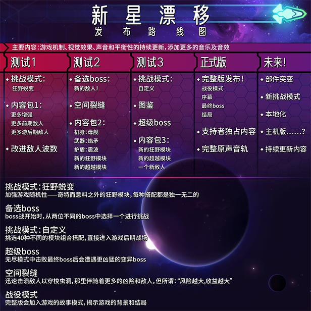 《新星漂移》由Chimeric的Jeffrey Nielson开发,几乎是一人完成,音乐音效由Pixeljam的Miles Tilmann提供。