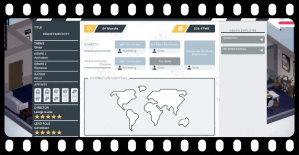 电影一旦就绪,就该决定要如何发行了。你可以亲力亲为、寻找合作伙伴,或是把发行权卖给出价最高的竞标者。每个选项都会带来不同的风险和收益,所以请基于你的财务状况和知名度谨慎做出选择。另外也别忘了留意竞争对手,挑选出最佳的上映日期。