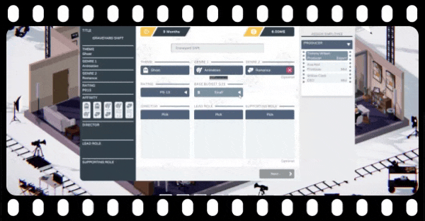 选择合适的主题、类型和目标评级来打造属于你自己的电影。撰写剧本,选用你最爱的明星阵容,决定预算的花费方式,让你的电影大放异彩。每一个决定都将成为影响电影口碑和票房表现的关键。